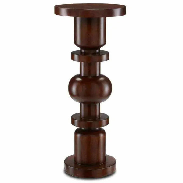 The Sasha Walnut Drinks Table is made of mahogany in a dark walnut finish. A juxtaposition of geometric shapes makes this occasional table a trickster: is it a chess piece or could it be a part from some exotic engine?