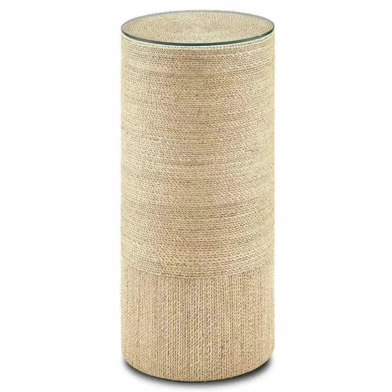 Embrace the exquisite and exclusive design of our Natural Macati Accent Table Pedestal. Each piece is masterfully crafted with fine, natural rope, showcasing the expertise of our talented artisans. The intricate rope work effortlessly flows into a glass disc, perfect as a pedestal or accent table. It is also offered in a taller version and square design. Wrapped in natural rope, the Macati Accent Table/Pedestal is made of wood and topped with a glass disc, displaying the meticulous artistry required to create such a cohesive flow.