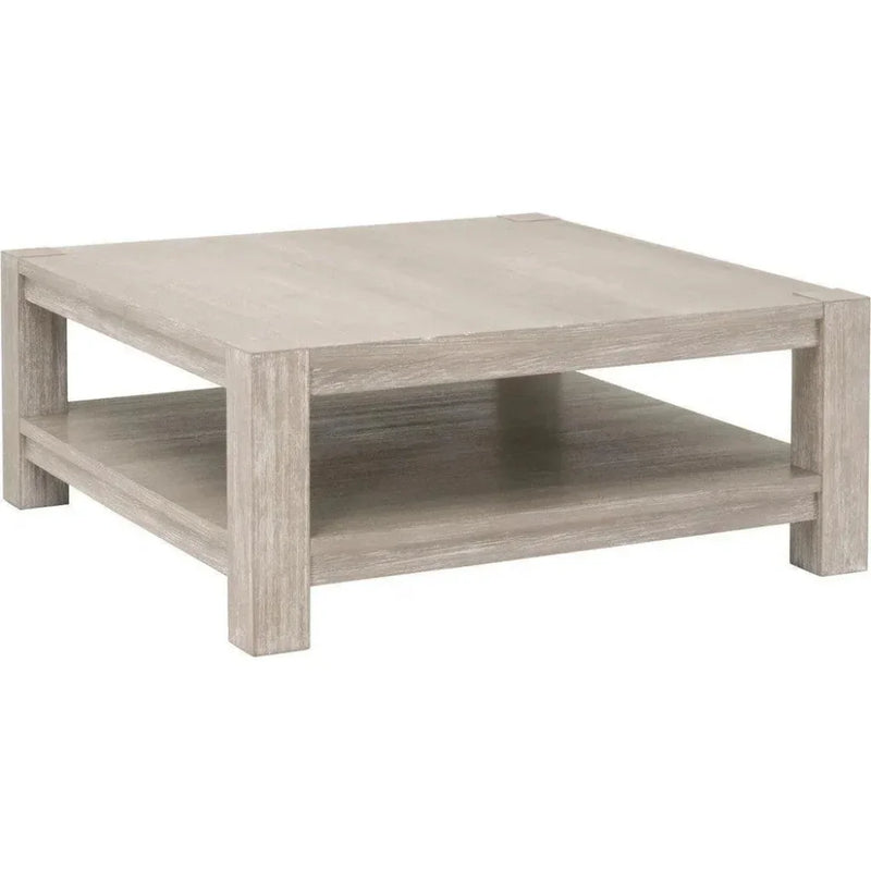 Enhance your living area with the transitional charm of this Adler Square Coffee Table by Essentials For Living. With a frame constructed from solid beech wood and adorned with acacia veneer, its natural gray finish radiates warmth and elegance. Crafted with a solid wood apron and veneer top and legs, this table is built to last. The finish features a slightly distressed texture, adding natural-looking elements and a modern look. Measuring 42" wide, 42" deep, and 17.5" high, it offers ample space for decor and essentials. Additionally, the lower storage shelf provides convenient organization without compromising on style. This stunning coffee table will supply plenty of space for your needs, as well as update your living space with its timeless look.