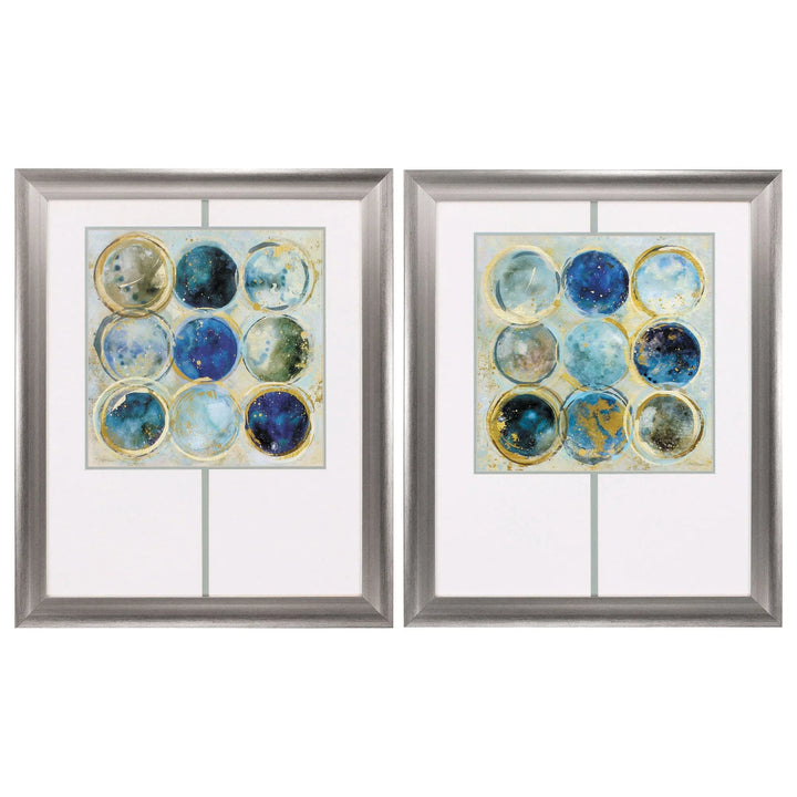 Transform any room with this striking set of two contemporary matted glass wall art pieces. Featuring a modern design with abstract circles in blue, gold, and white hues, these art pieces are sure to catch the eye. Each piece is double matted with a heavy bottom and a channel cut, enhancing the visual depth and appeal. The artwork is protected under glass and framed in a sleek brushed silver frame, adding a sophisticated touch to your space.