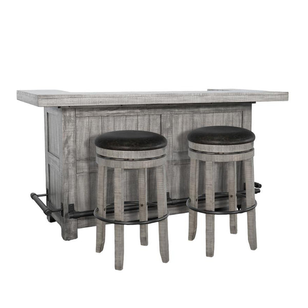 Mahogany construction brings a touch of elegance to any home with this home bar set. It's perfect for hosting gatherings, thanks to its multiple storage compartments and a convenient stemware rack. This means you can keep your wine glasses and bottles organized and within reach. The Alpine Grey finish gives it a modern vibe that fits well with different decor styles. Another thing you will like is the pull-out cutting board tray, which makes preparing garnishes a breeze. With the included bar and two stools, this set offers a complete solution for your home entertaining needs. You'll also appreciate the metal foot rail that adds both style and comfort for your guests. This set combines functionality and style, making it an excellent addition to any living space.