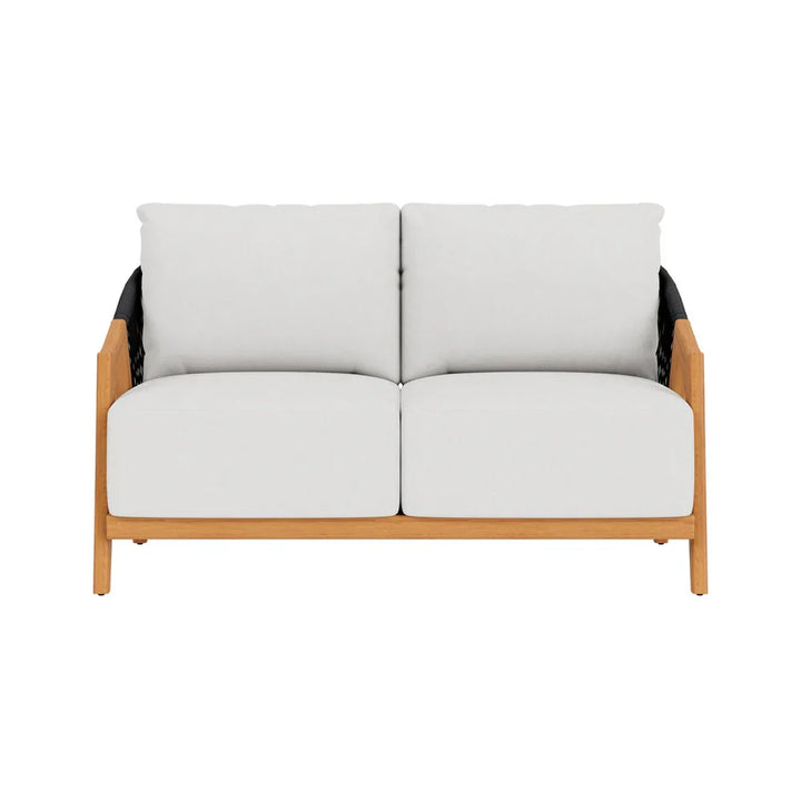 The Alpine Teak Wooden Outdoor Loveseat seamlessly merges contemporary design with exceptional comfort. Constructed from solid premium teak, prized for its strength and refined appearance, the loveseat features a sleek, angular frame that complements both indoor and outdoor settings. Its weather-resistant rope wrapping enhances durability and style, suitable for year-round enjoyment. The warm light brown wood finish contrasts elegantly with the black woven backrest, creating a visually appealing focal point. Designed for cozy seating, the loveseat includes plush cushions that ensure lasting comfort. Its versatile modern aesthetic integrates effortlessly with diverse decor, making it a sophisticated and inviting addition to any space.