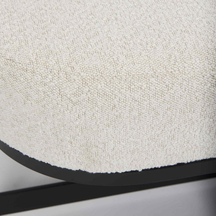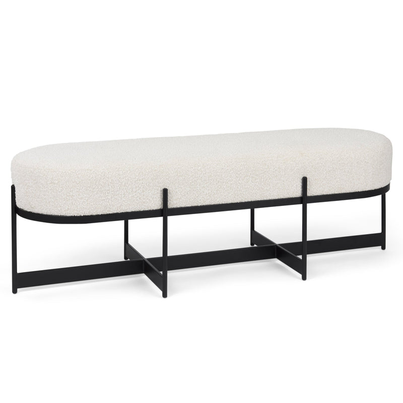 The Amelia Cream Boucle Bedroom Bench combines a modern look with elegant touches, making it a great addition to any bedroom or living space. Its elongated oval shape offers a stylish silhouette, while the off-white cushioned seat provides a comfortable place to sit or rest items. Crafted from indulgent creamy boucle fabric, the bench offers a luxurious texture that stands out in any room. The strong, matte black, powder-coated iron base provides stability and contrasts beautifully with the soft fabric, creating a striking visual appeal.