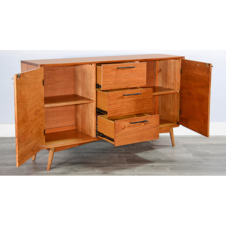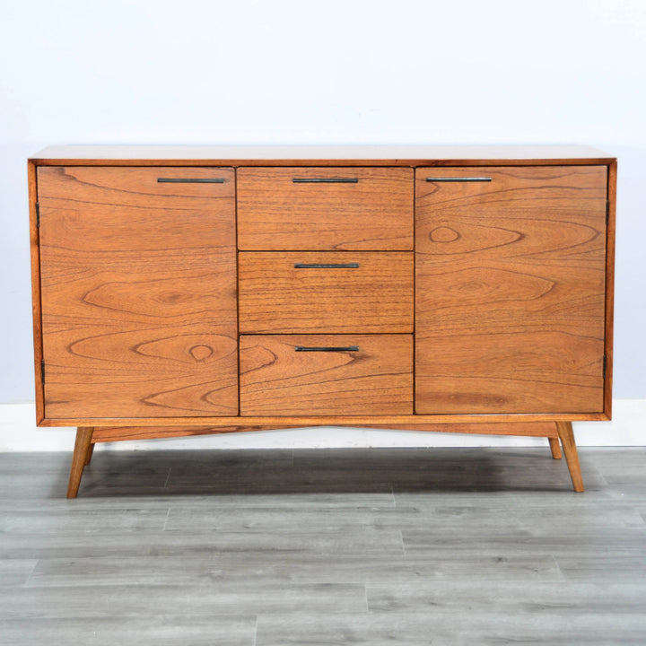 This mid-century buffet combines style and practicality with its sleek design. It features three spacious drawers and two cabinets, offering ample storage space to keep your items organized. The smooth surface and clean lines, paired with tapered legs, highlight the minimalist appeal of mid-century modern aesthetics. Crafted from Mindi wood and finished in a warm medium brown, it enhances any room with its timeless charm. Its sturdy build ensures longevity, while the elegant design complements various interior styles. No assembly is required, making it a hassle-free addition to your home.