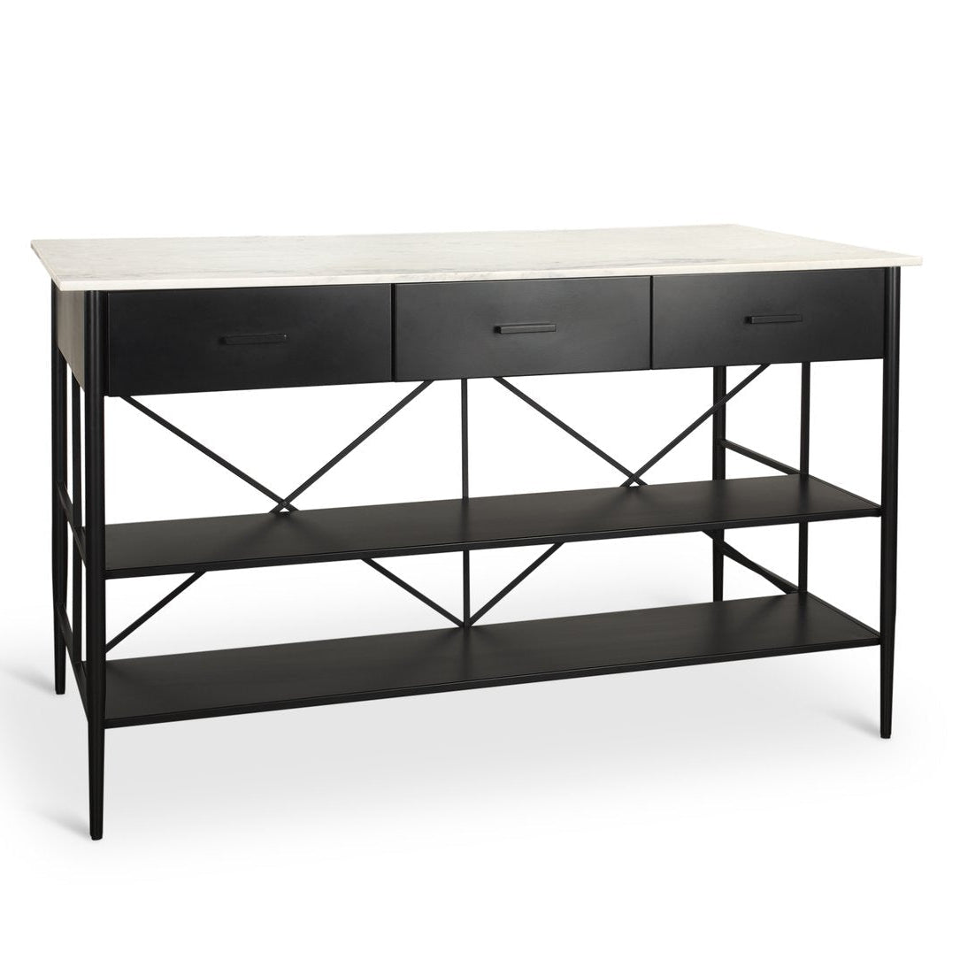 Marble gives the Amika Kitchen Island its luxurious feel. With a smooth, white banswara marble top featuring unique gray veining, it's set on a sturdy matte black iron frame. This kitchen island includes three drawers perfect for storing utensils, spices, and more, while two open shelves offer space to display cookware or other items. The open area at the back is great for tucking in bar stools, transforming it into a casual dining spot. Its timeless design and sophisticated color palette mean it will remain stylish for years to come. This is a versatile piece that blends function and elegance.