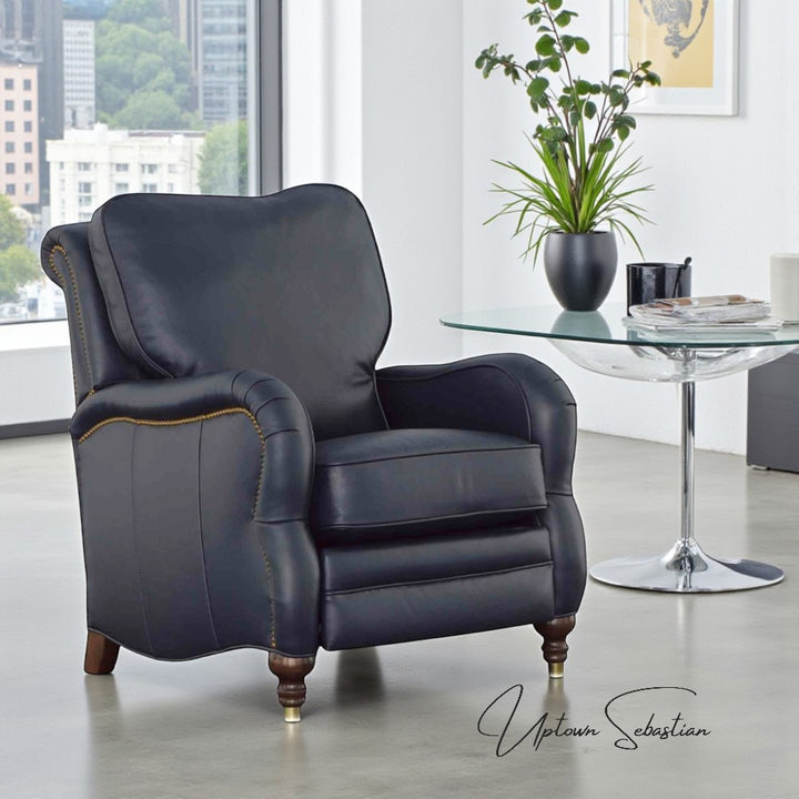 Discover the perfect fusion of classic aesthetics and effortless relaxation with the Anchor Leather Power Push Button Recliner. Crafted for discerning tastes, this piece captures the essence of timeless design, offering a sophisticated look without sacrificing the ultimate in push-button convenience. It is distinguished by its rich, dark leather and handsome nailhead trim that traces its elegant curves, while classic turned front legs with brass casters add a touch of heritage charm. Behind its polished exterior, a smooth power reclining mechanism and plush cushioning invite you to find your ideal position of comfort with a simple touch.