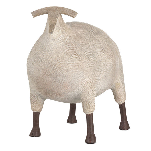 The Ancient Ram Sculpture is crafted from beige composite with contrasting black hooves. A modernized interpretation of the ram, its face and ears are stylized into a bold “T” shape with a sharp point and curved cross edges. The body is carved with textural detailing to suggest woolly fur, blending abstraction with natural reference in this contemporary decorative piece. Due to the artisanal finish, the surface of each accessory could differ slightly.