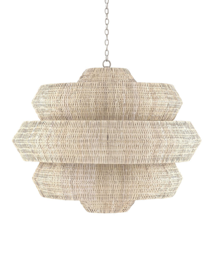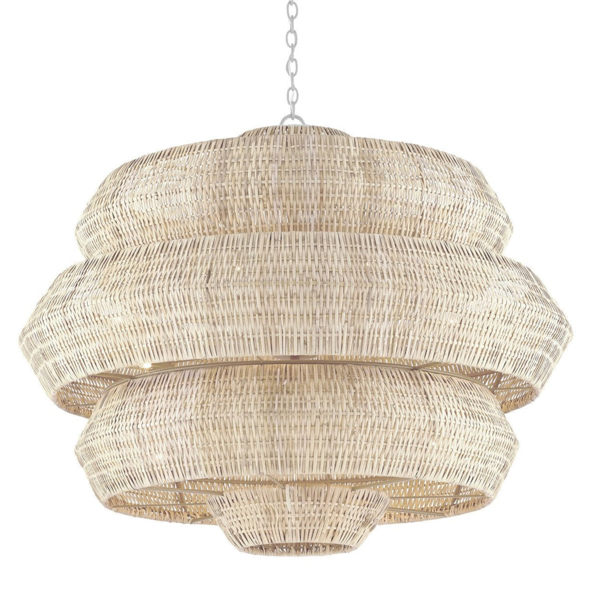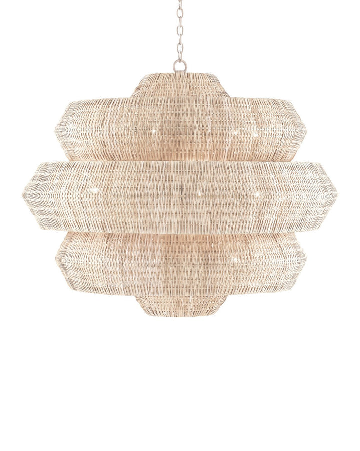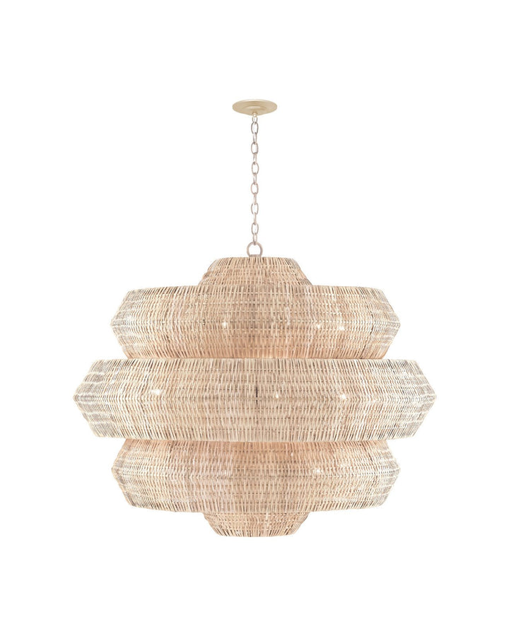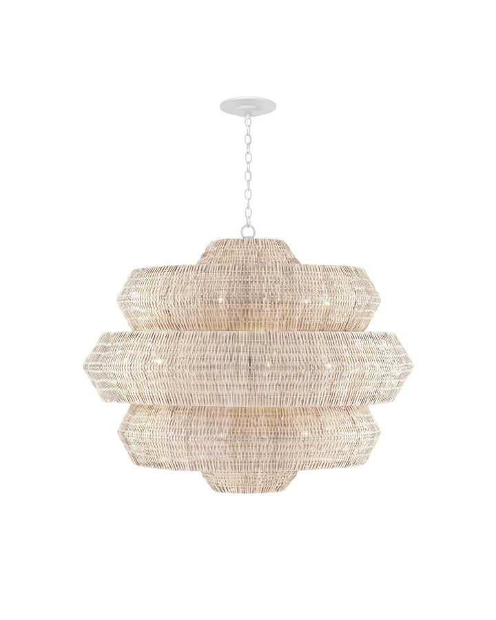 The Antibes Grande White Chandelier brings a touch of elegance and natural beauty to any space. Crafted from natural bleached rattan, it is woven over a geometric wrought iron frame finished in a soft snow white. Its bold and large design, with a diameter of 48 inches, makes it a striking centerpiece. Yet, its airy structure ensures it does not overwhelm the room, maintaining a light and inviting feel. Nestled within this stunning piece are eighteen lights that provide ample illumination and highlight the lovely texture of the rattan. Whether placed in a dining room, living room, or large foyer, this chandelier adds a dash of sophistication and warmth.
