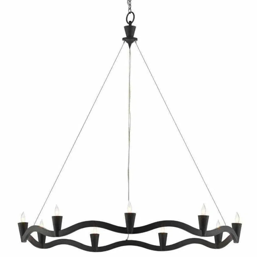 Our Serpentina Chandelier is made of wrought iron in an antique black finish. The lightness of this design stems from the aircraft cable that suspends the serpentine bottom ring from the plumb bob-like top cap on this black chandelier. Adjustable from 46.5" to 114.5" with use of included chain/rod kit/cable. If your space calls for a longer drop, additional chain/rods/cable is available for purchase.