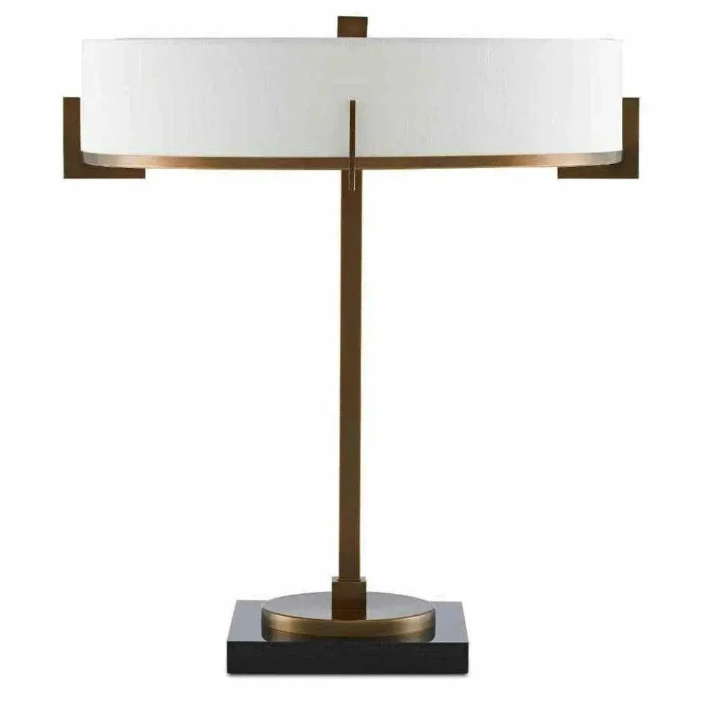 Design notes of our Jacobi Table Lamp include the thin stem rising from a black marble base that is similar in width to the finial, the sleek off-white shantung shade, and how the shade is clasped by geometric accents. This gold lamp is made of metal in a brushed brass finish.