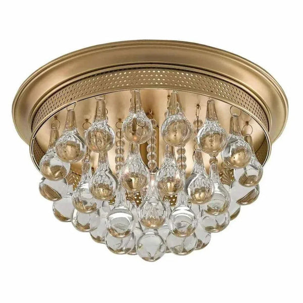 Crystal droplets rain down from the center of the Worthing Flush Mount. The opulence of the crystals contrast the perforated brass ceiling mount in an antique brass finish. The stylish juxtaposition of materials on this gold flush mount exudes both lightness and warmth.