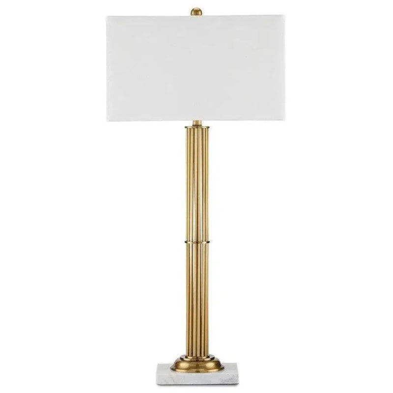 The white marble base and rectangular shade serve as a subtle contrast to the warm metal, complete with a matching antique brass finial. Add a sense of luxury and sophistication to your home, with the distinguished details of the Allegory Table Lamp's antique brass finish and central ring, paired with the visually striking marble base and rectangular shade. Its design seamlessly combines art and practicality, making it a sophisticated touch to any space.