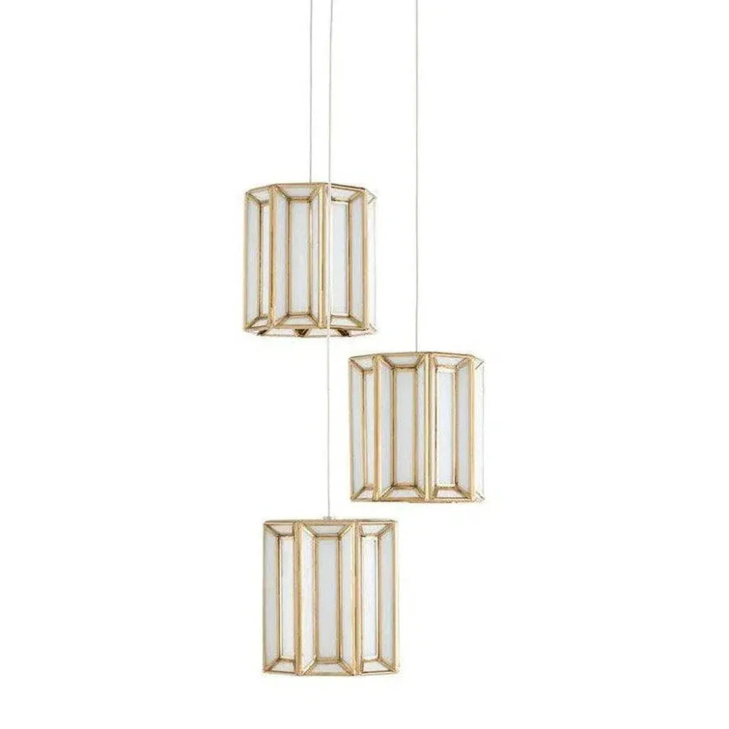 When a soft glow is desired, milk glass is one of the best materials to diffuse illumination. Our Daze 3-Light Multi-Drop Pendant is made of articulated panels of white milk glass that are joined together by ribs of metal in an antique brass finish. This brass and white multi-drop pendant, designed by Clarence Mallari, will turn luminous when it is switched on. The canopy of this piece is luminous in a painted silver finish. This fixture is among Currey & Company's multi-drop pendant collection, which includes multiple configurations.