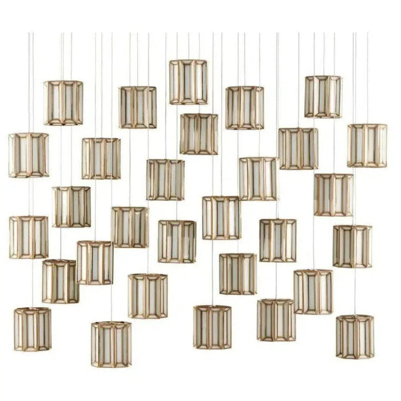 When a soft glow is desired, milk glass is one of the best materials to diffuse illumination. Our Daze 30-Light Multi-Drop Pendant is made of articulated panels of white milk glass that are joined together by ribs of metal in an antique brass finish. This brass and white multi-drop pendant, designed by Clarence Mallari, will turn luminous when it is switched on. The canopy of this piece is luminous in a painted silver finish. This fixture is among Currey & Company's multi-drop pendant collection, which includes multiple configurations.