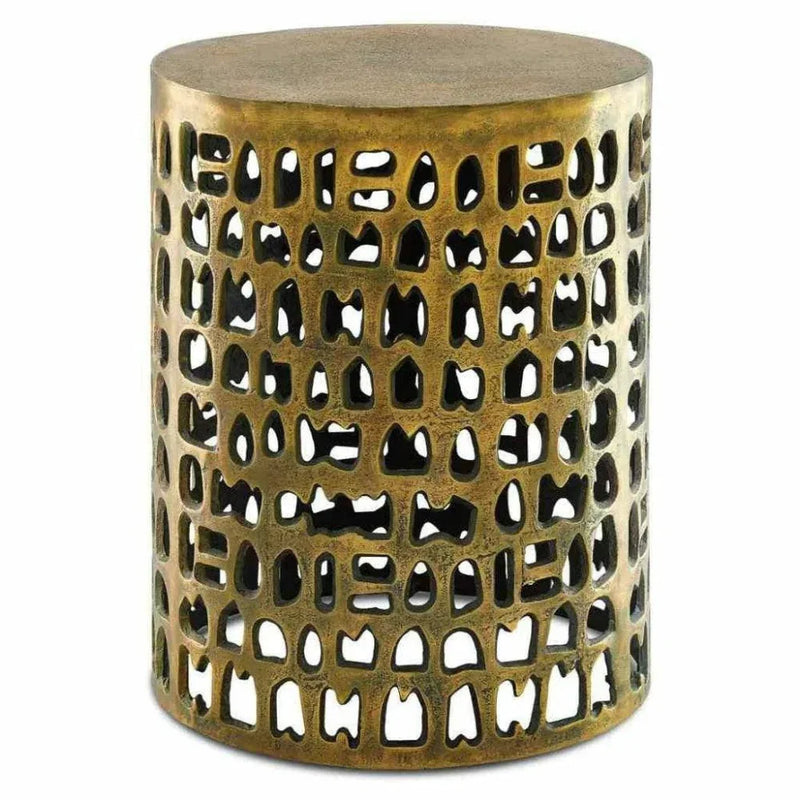 Introducing the Antique Gold Alvar Accent Table - a work of art that brings cultural sophistication to your home. Its intricate cutouts, reminiscent of tribal designs, add a touch of luxury. A must-have for those who appreciate a fusion of modern and folk elements. An ethnic variation on the drum table, the organic cutouts in toothy shapes give the Alvar Accent Table a sophisticated tribal-like twist.