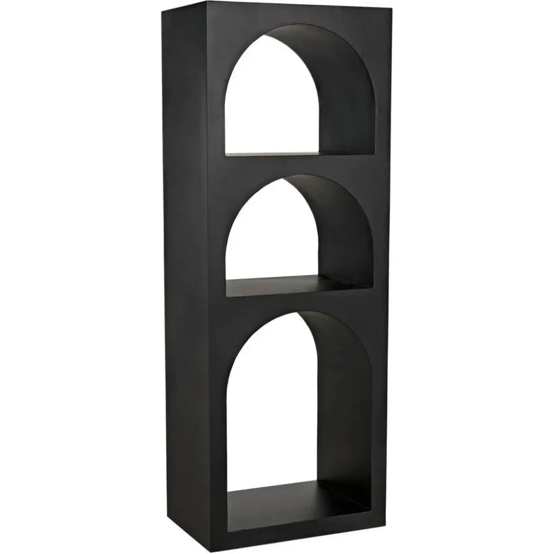 The Aqueduct Etageres blend ancient architectural inspiration with modern design, offering striking functionality in three different sizes. Crafted from sturdy black-finished metal or industrial steel, each piece features a monolithic silhouette with arch motifs that evoke the grandeur of classic aqueducts. Whether displayed alone or grouped together, these etageres bring sculptural presence and practical storage to any room. The tall 91-inch version provides a commanding vertical display, while the 72-inch model and the medium 18-inch wide option allow for flexible arrangements. Perfect for showcasing books, art, and decor, their timeless structure and matte black finish make them ideal additions to contemporary or transitional spaces.