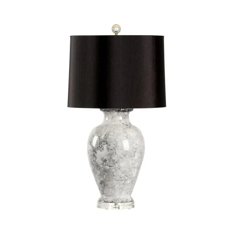 The Argento Lamp brings a touch of elegance and sophistication to any space. Crafted from Italian ceramic, it features a stunning urn shape with an aged cream and black bubble water glaze, giving it a unique and artistic flair. The glossy finish enhances its beautiful marbled Grey base, making it a standout piece in any room. The lamp is mounted on a clear acrylic base, offering stability while adding a modern touch to its classic design. The black shade complements the base perfectly, providing a soft and inviting glow when lit. This lamp is not just about aesthetics. It's designed by Vietri, known for their attention to detail and quality craftsmanship.