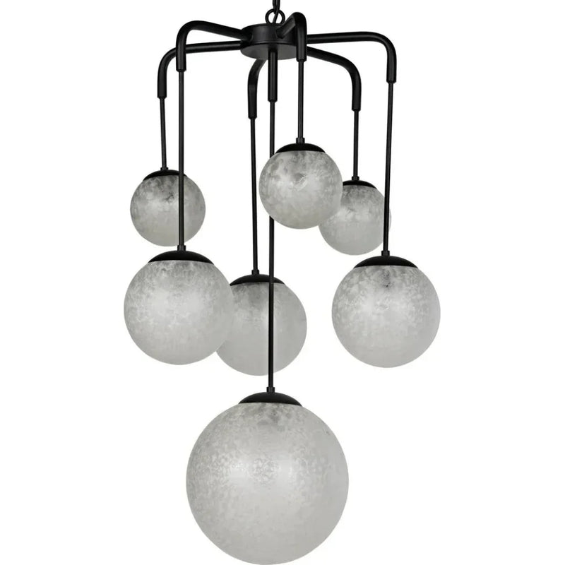 The Artemis Chandelier embodies ethereal elegance with its seven handblown glass bubbles suspended by delicate black metal arms. Crafted with precision and attention to detail, this stunning statement piece is sure to elevate any space. The unique design creates an ethereal lighting experience, making it perfect for adding a touch of sophistication to any room. Seven handblown glass bubbles are suspended by delicate black metal arms to create the ethereal Artemis chandelier. A stunning statement piece crafted with handblown glass and delicate black metal arms. Its unique design of seven suspended bubbles creates an ethereal lighting experience.