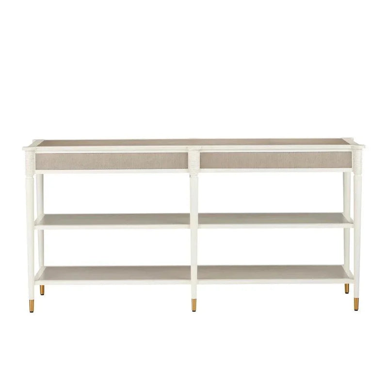 Welcome the luxurious and sophisticated Aster Console Table into your home. Crafted from mahogany and oak, this piece, inspired by an antique from the Winterthur Museum, elevates any space. Its off-white and fog finishes add timeless charm, while the polished brass ferrules and two shelves provide both practical storage and exquisite design. As part of the exclusive Winterthur Collection, this console table is a must-have for tasteful homes.