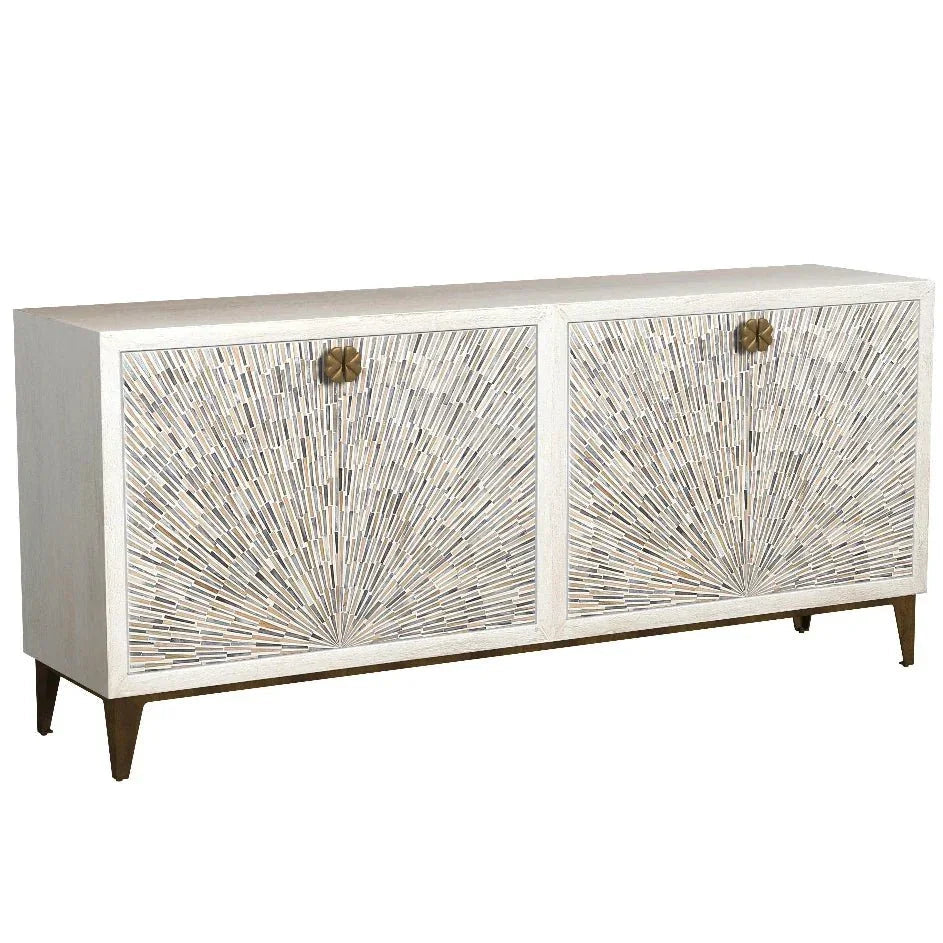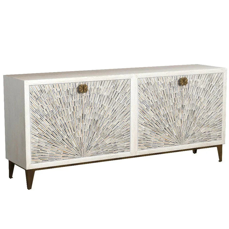Crafted with care from high-quality materials, this server is a stunning addition to your home. The hand-stained bone, resin, and wood chips create a vibrant sunburst pattern on the four doors, elevating any room. With an antique gold metal base and solid mango frame finished in white wash, this server exudes sophistication and luxury. Experience the perfect blend of style and practicality with the Astrid Server.