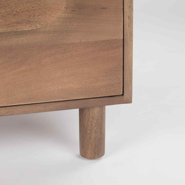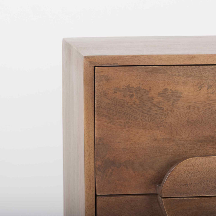 The Astrid Three-DrawersThree-Drawers Wood Cabinet brings a touch of elegance to any modern living space. Crafted from solid mango wood, this cabinet boasts a rich brown finish that highlights the natural beauty of the wood grain. Its minimalist design, complemented by elegantly detailed handles, adds a sophisticated charm to both home and office settings. With its robust construction, the cabinet promises durability and style, making it a valuable addition to any room.