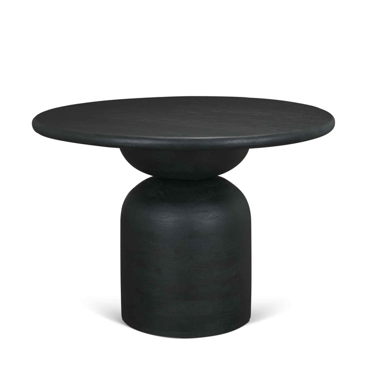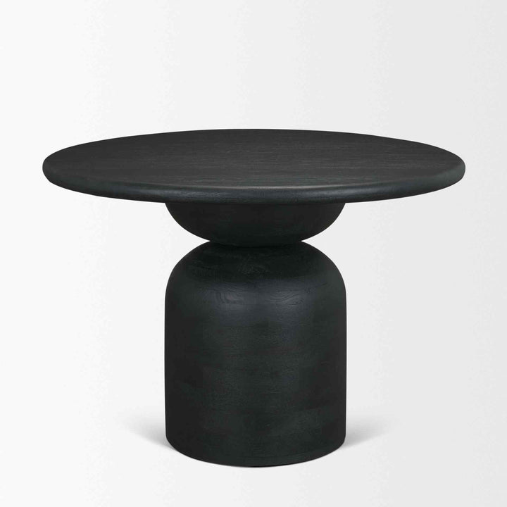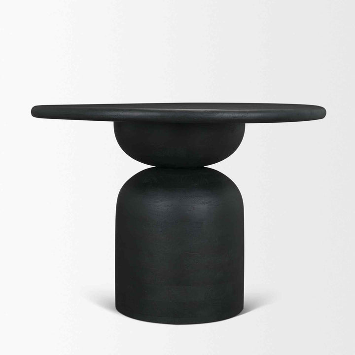 The Atlas 42" Black Wood Round Dining Table adds a touch of elegance to any dining space. Its round tabletop is crafted from solid mango wood, finished in a matte black sandblasted look, which enhances its natural beauty. The table stands on a unique stacked geometric pedestal base that features a bricklay pattern, providing both stability and style. This black wood table blends seamlessly into modern dining rooms or contemporary gathering spaces. With its durable design and stylish appearance, it’s a perfect centerpiece for family meals or entertaining guests, offering a blend of function and fashion for any home.