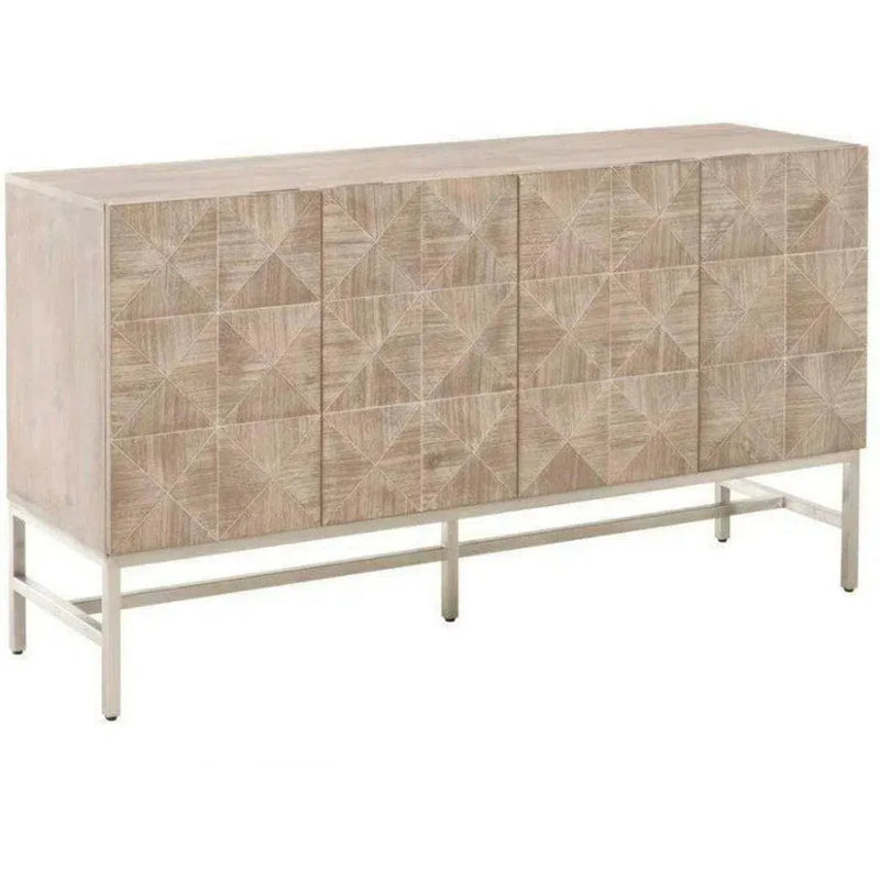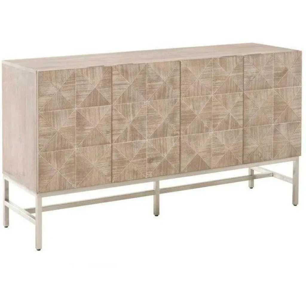 Elevate your home decor with the sophisticated and exclusive elegance of our Atlas Media Sideboard. Crafted with sandblasted Acacia veneer showcasing the natural beauty and texture of the wood, this stunning transitional style piece features a natural gray finish and raised diamond pattern door panels. Every item in this collection is uniquely made, incorporating the subtle imperfections of knots, cracks, and scratches that only add to its luxury. Protect and elevate your decor with this truly one-of-a-kind sideboard, featuring a Brushed Stainless Steel base and a sandblasted Acacia Veneer finish that brings out the wood's natural grain and creates a rustic appearance. Each piece is handcrafted and may contain natural variations, further enhancing its character and charm.