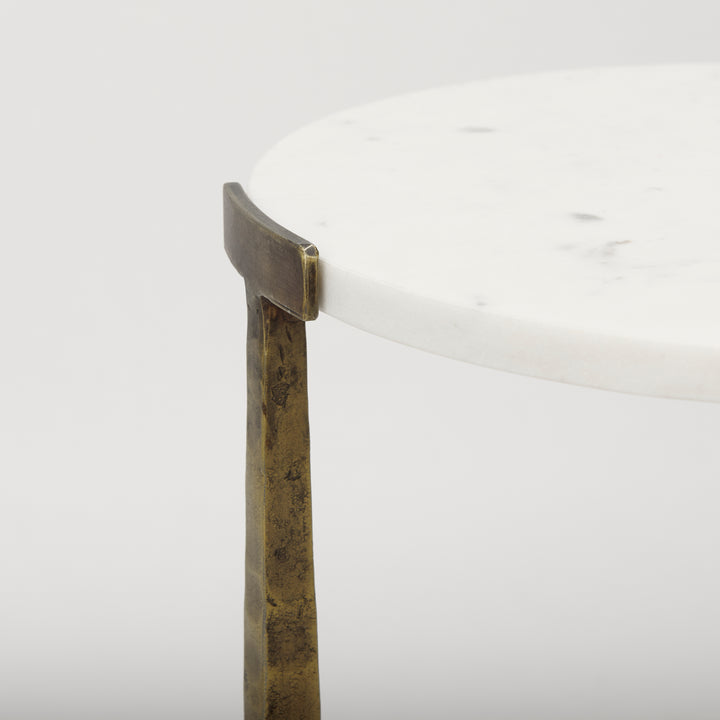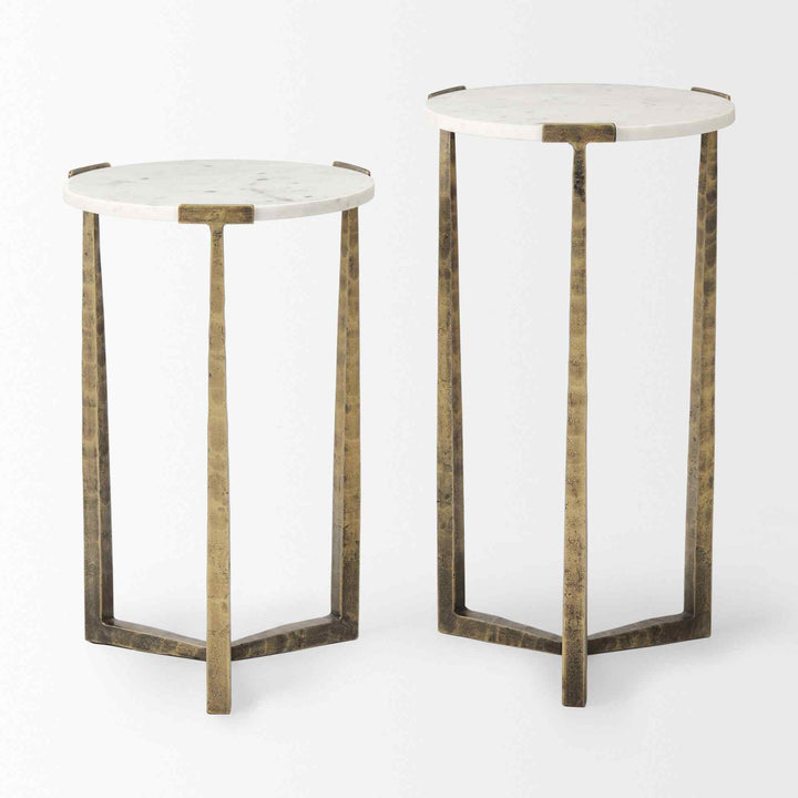 This set of marble nesting tables brings a refined elegance to any living space. Featuring solid white marble tops, these tables are as unique as they are beautiful. The natural marble ensures that each piece boasts its own distinct patterns and textures, adding a touch of subtle sophistication to your home. The tables are supported by a sturdy hammered iron frame, finished in a warm antique gold. This combination of materials provides a modern yet timeless appeal, making them a versatile addition to any decor style.