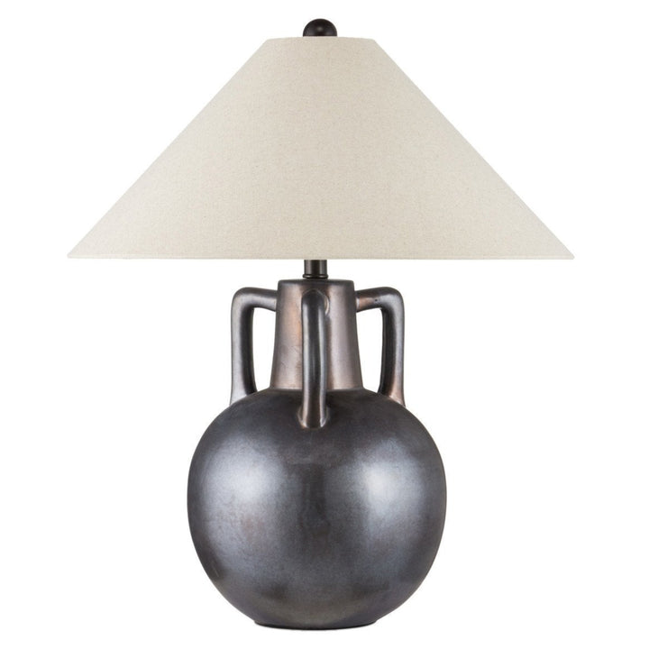The Autry Table Lamp brings a touch of elegance to any room. Its ceramic body, shaped like a jug with three handles, features a unique hand-sprayed reactive glaze. This finish creates a marbled, metallic glow that makes each lamp distinct. The artisanal glaze process gives the brown surface a rich depth and subtle variations in tone, making it a centerpiece wherever it stands. This lamp’s tonal bronze-finished hardware and matching finial seamlessly blend with the body, enhancing its cohesive look.