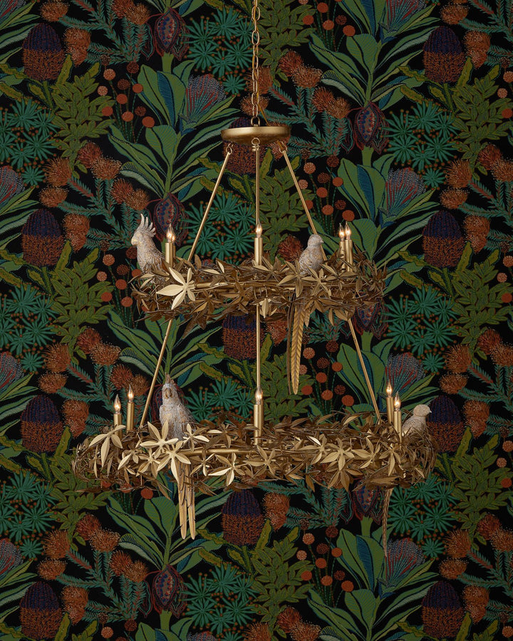 The Aviary Gold Two-Tier Chandelier brings a touch of elegance and nature into any room. This exquisite chandelier features intricate leaf and floral motifs in a Swedish Gold finish, creating a luxurious and refined look. Sculptural birds—cockatiels, sparrows, and macaws—are nestled among the botanical elements, showcasing the artistry of a skilled sculptor. The free-flowing metal feathers add depth and charm, making this chandelier a stunning centerpiece in any space.