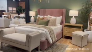 Balboa Bed by Essentials For Living features sumptuous petal pink velvet upholstery. Crafted with durable materials, this transitional masterpiece features a fully upholstered headboard, side rails, and a footboard with exposed oak wood feet. The winged headboard and meticulous edge piping detail enhance its refined aesthetic, while the curved footboard design rounds out the piece for a sophisticated allure. Supported by solid oak legs, this bed comes with a removable metal frame European slat system for added durability and support. This elegant bed frame is perfect for creating a serene retreat in your home.