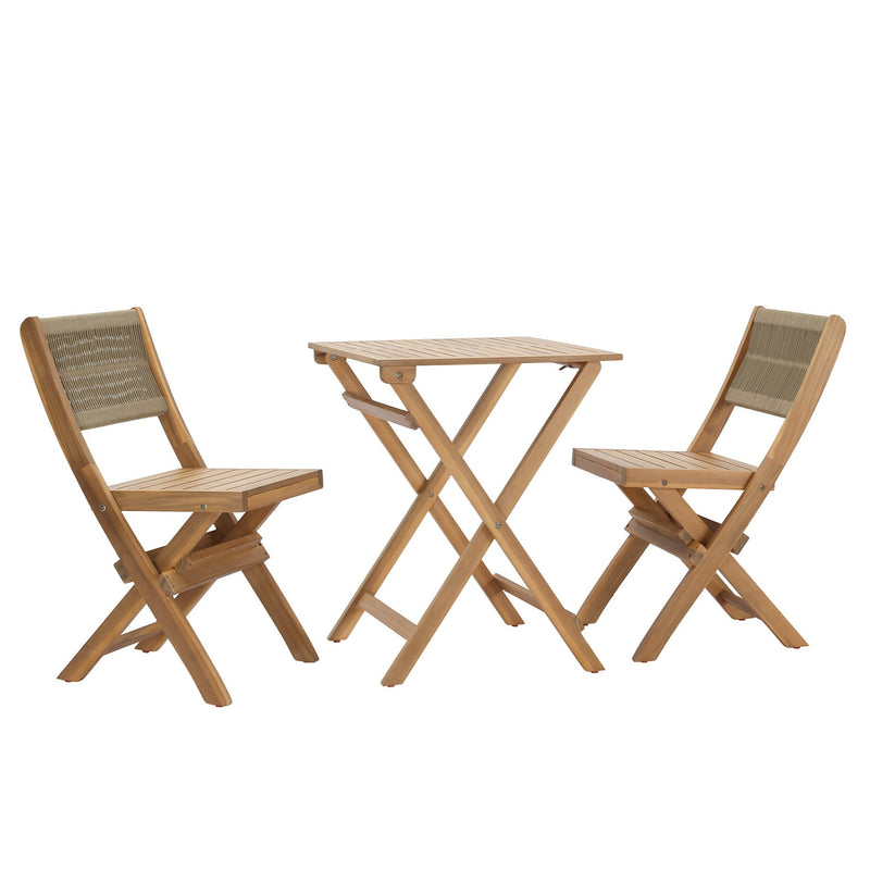 Create your own cozy outdoor getaway with this Foldable 3-Piece Bistro Set. Handcrafted from premium solid acacia wood, it offers outstanding durability and natural weather resistance. Its warm light-teak finish brings timeless style, while chic rope-back chairs provide breathable, supportive comfort with a modern twist. This set is perfect for morning coffee, sunset wine, or intimate meals. Its space-saving design folds flat for easy, compact storage—ideal for balconies, patios, decks, and gardens where every inch counts. Enhance your outdoor living space with this stylish and practical bistro set.