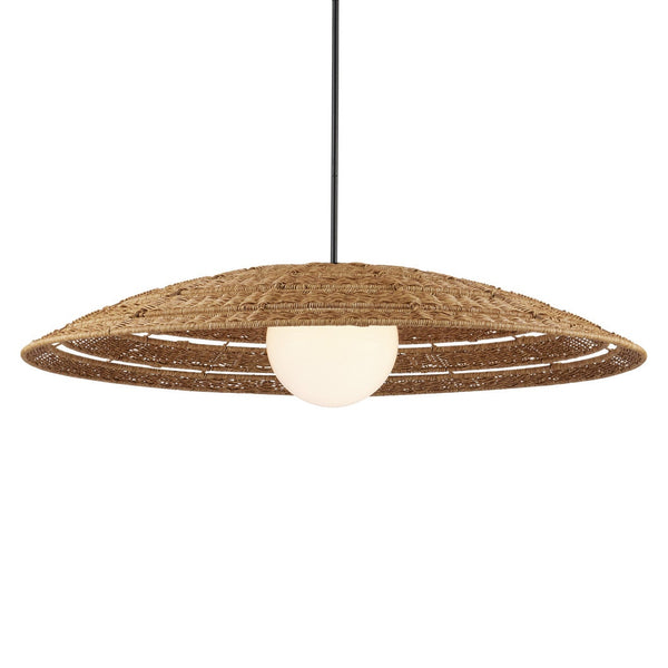 The Barbary Outdoor Pendant has an inverted bowl-shaped shade made of all-weather wicker that can easily withstand the elements, as will the rod from which it hangs in a black powder-coated finish. The uniform weave on the tan pendant is painstakingly achieved by hand, and a sophisticated detail is how the milk-glass globe on the one-light pendant glows through the circular cut out. The Barbary is wet location-tested so it is ideal for illuminating patios and porches.