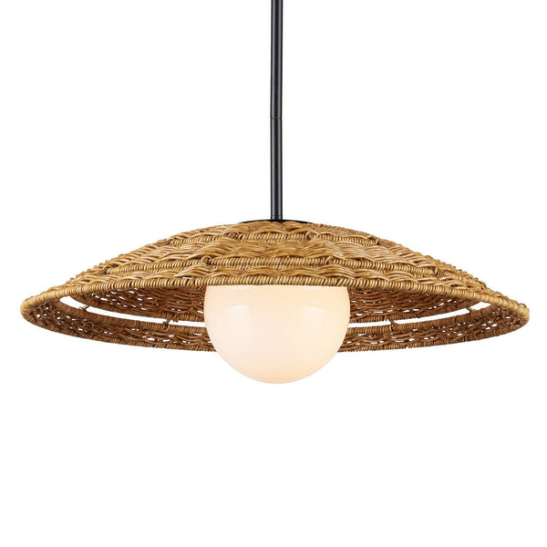 The Barbary Small Outdoor Pendant has an inverted bowl-shaped shade made of all-weather wicker that can easily withstand the elements, as will the rod from which it hangs in a black powder-coated finish. The uniform weave on the tan pendant is painstakingly achieved by hand, and a sophisticated detail is how the milk-glass globe on the one-light pendant glows through the circular cut out. The Barbary is wet location-tested so it is ideal for illuminating patios and porches.