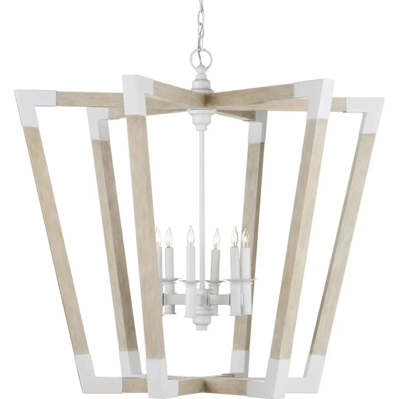 The Bastian Large Sandstone Lantern by Currey and Co. is a stunning representation of the Arts Crafts movement, constructed with wrought iron and wood in sugar white and sandstone finishes. The intricate combination of washed wood and white metal brings a touch of refinement to the lantern-shaped chandelier, making it a perfect addition to any space.