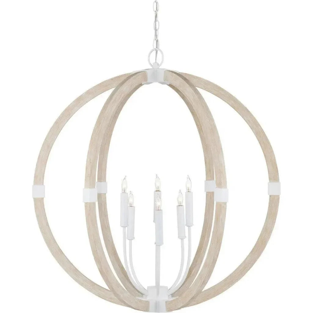 Elevate your space with the timeless elegance of the Bastian Sandstone Orb Chandelier. Inspired by the Arts & Crafts movement, this stunning fixture features wrought iron and wood in sugar white and sandstone finishes. The white metal clasps the washed wood spokes, adding a touch of sophistication. Modern yet refined, this chandelier brings a unique blend of classic and contemporary design to any room.