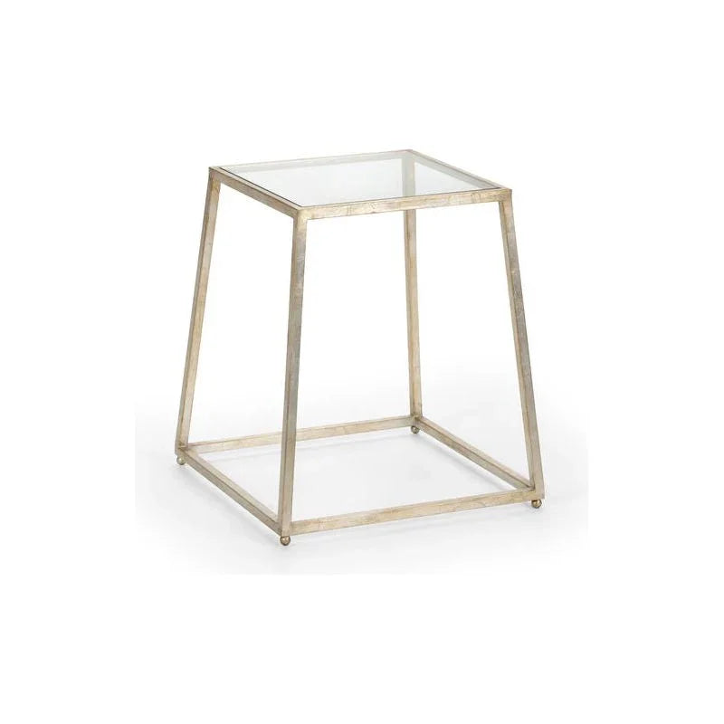 The Bauhaus Table in silver brings a touch of modern elegance to any room. Its sleek design features a clear tempered glass top with beveled edges, adding a sophisticated look while ensuring durability. The metallic frame with an antique silver ang gold leaf finish exudes a contemporary charm, perfectly complementing the square glass top. Designed by Jamie Merida, this table stands out with its unique trapezoidal shape, making it a striking accent piece for your living space. Crafted with precision, this side table is not just about style but also functionality. The glass top offers a clear view of the intricate frame below, creating a sense of openness and space. Whether you use it to display your favorite décor or as a practical side table, its versatile design fits seamlessly into any setting.