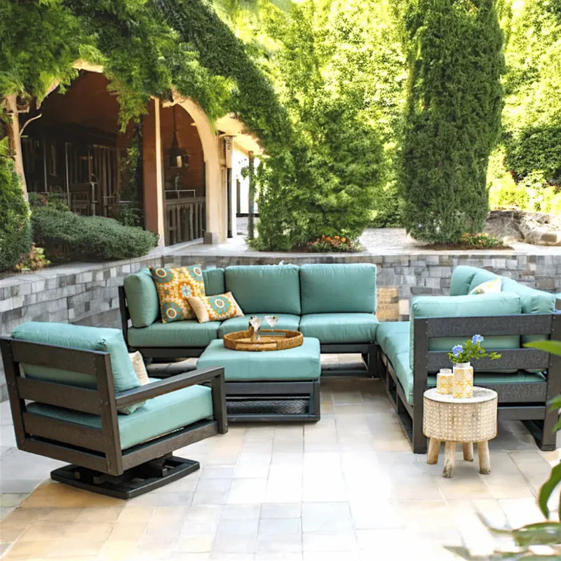 This high-quality 8-piece set is crafted with recycled plastic and offers both comfort and style throughout the year. Featuring a durable design that is resistant to weather, mold, and mildew, this set is made in the USA from recycled milk jugs. Choose from a variety of cushion colors and fabrics, including options that are specially designed to effectively drain water after rainfall. The set also includes a swivel rocker club chair and square ottoman, all made with low-maintenance and easy to clean materials. With assembly required and a limited pro-rated lifetime warranty, this set is the perfect addition to any outdoor space. Whether you're enjoying a spring afternoon or a cool autumn evening, you'll experience the utmost comfort and style with this set, which also boasts water-dissipating cushions in a range of colors and fabric styles from Sunbrella. This set contains 1 swivel rocker club chair, 4 modular armless chairs, 2 modular wedges/corner chairs, and 1 square ottoman.