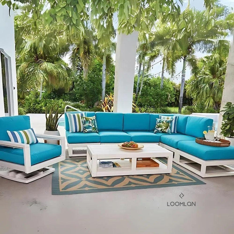 Whether it's a spring day or a cool autumn evening, you can bask in the sun or cozy up with a book and blanket in optimum comfort and style. The cushions, available in various colors and fabric styles from Sunbrella, effectively drain water after rain. The set includes 1 square ottoman, 1 rectangle coffee table, 1 swivel rocker club chair, 4 modular armless chairs, 1 modular wedges/corner chair with your choice of frame and Sunbrella cushions.