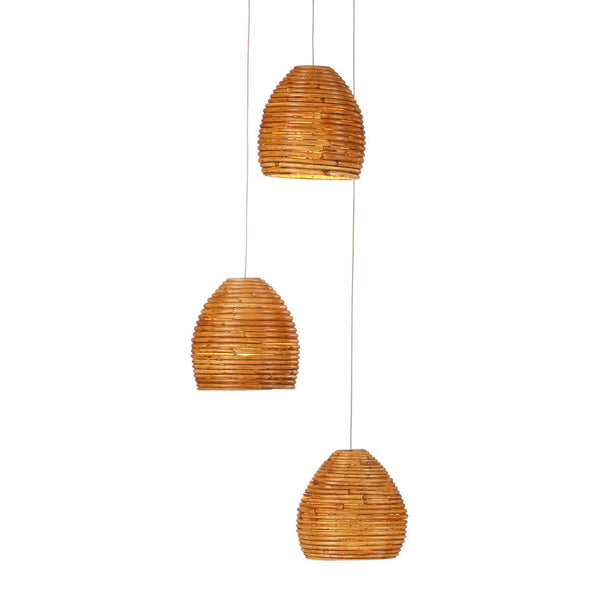 The Beehive 3-Light Multi-Drop Pendant has rattan bell-shaped shades. Because the natural material is not perfectly uniform, there are fissures in the shades that allow illumination to escape to create a warm glow. The canopy of this piece is luminous in a painted silver finish. This fixture is among Currey & Company's multi-drop pendant collection, which includes multiple configurations.