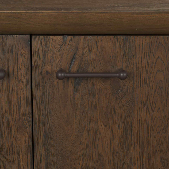 The Belford 94" Dark Brown Oak Wood Media Console is a perfect blend of style and function. This media console is crafted from solid oak and oak veneer, showing off a dark brown finish with a rough wire-brushed texture that highlights the wood's natural beauty. It offers ample storage with central drawers, pull-down cabinet fronts for easy cable access, and side cabinets with shelving. This makes it a practical choice for keeping living areas tidy. Its rich character fits well in both dining rooms and living spaces, adding a touch of elegance and warmth to any room.