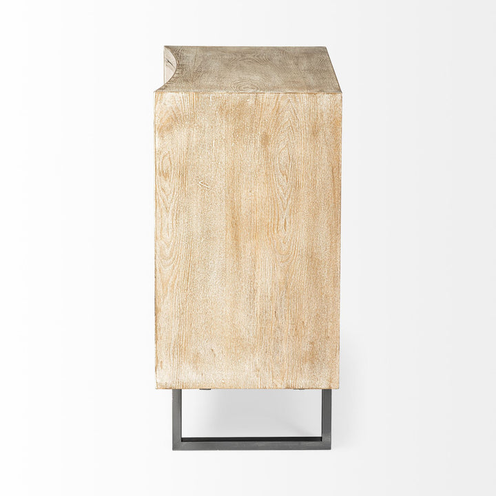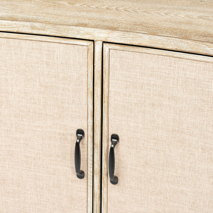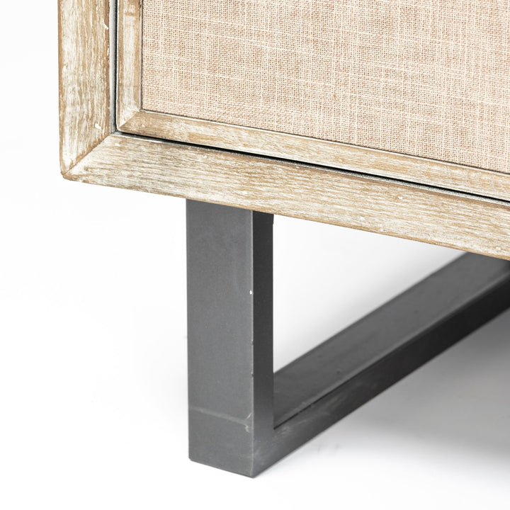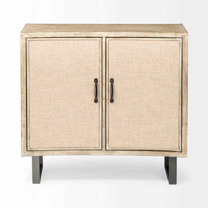 - The Bellefontaine features a natural grain finished fir wood body with two beige fabric-covered doors, supported by stylish graphite iron legs.