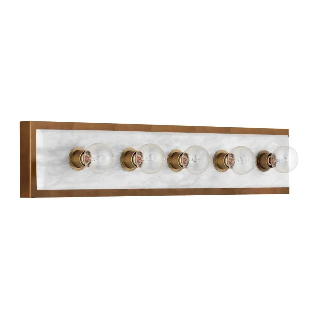 The Berdine Large Brass Bath Bar features a sleek, minimalist silhouette that lets the natural beauty of alabaster take center stage. Crafted from metal in an antique brass finish, its warm golden tones provide a striking contrast to the cool, luminous quality of the alabaster panel. This thoughtful pairing of materials creates a refined yet understated complexity, making the fixture a versatile choice for both contemporary and classic bathroom designs.