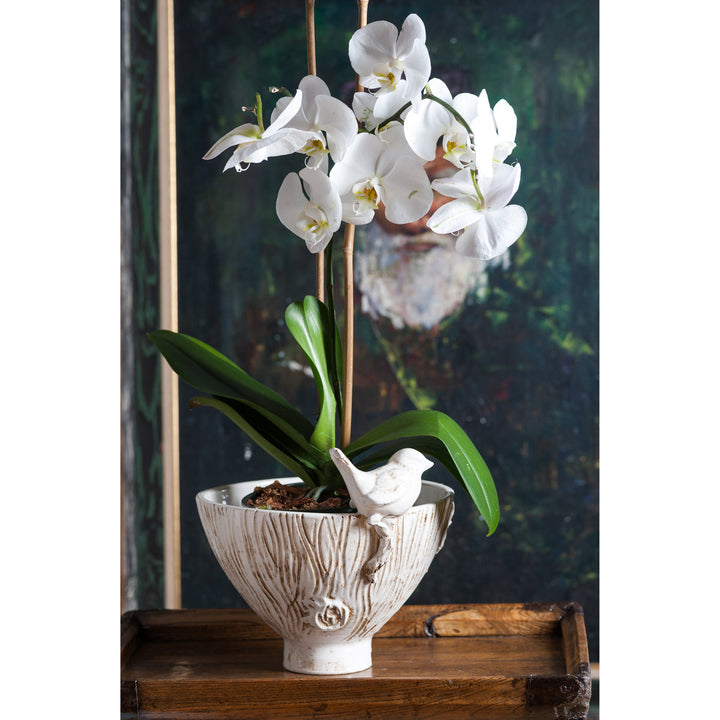 This artisan-crafted ceramic bowl brings a touch of elegance to any setting with its unique bird and branch design. The detailed craftsmanship highlights the skill of Italian artisans, ensuring each piece is distinct. Its soft, white textured finish complements various decor styles, making it versatile for any occasion or season. Whether used as a centerpiece or a functional serving bowl, it seamlessly blends beauty and utility. The bowl's round shape and small base provide stability and a classic look. The bird figurine perched on the rim adds a whimsical touch, enhancing its appeal. Made from high-quality ceramic, this bowl ensures durability while retaining a sophisticated appearance. Its neutral beige color and wood texture allow it to fit effortlessly into any kitchen or dining room.