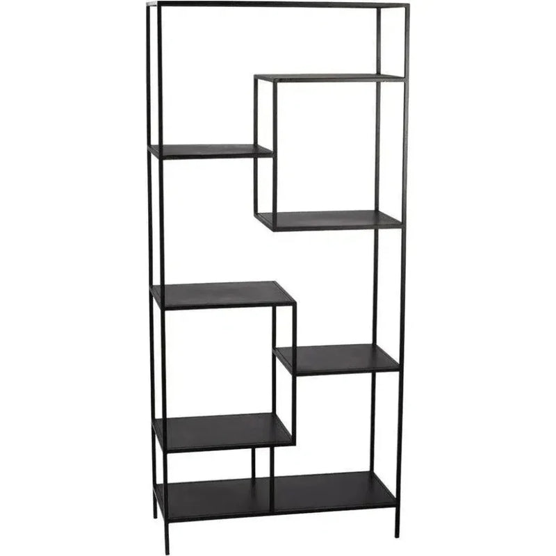 Add sophistication to your environment with our exquisite Black Iron Element Etagere. Its asymmetrical shelves and supports form a visually striking piece that also serves as a room divider. Finished on all sides, this elegant and versatile etagere will make a wonderful focal point in your room or combine two for a larger, mirrored masterpiece. The black metal shelves and supports are arranged asymmetrically, creating a chic open-work design. Use two of these shelves side-by-side to create a larger piece that mirrors itself and provides twice the functionality. Our Black Iron Element Etagere harmoniously combines art and function with its dynamic iron shelves arranged in an asymmetrical pattern. Use it as a room divider and create a larger, reflective art piece that also serves a practical purpose.