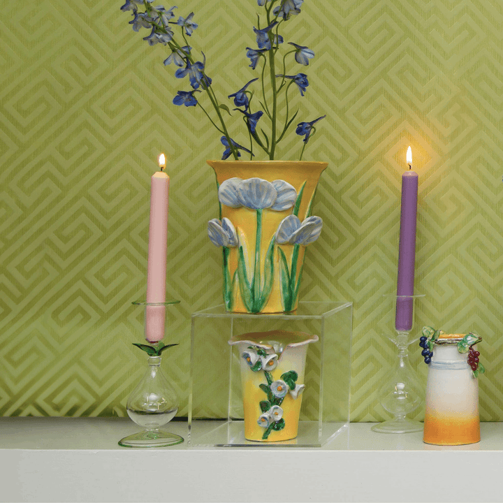Step into a tranquil garden setting with the Small White Vase adorned with Blue Bells. This limited edition piece transports the elegance and charm of a classic Italian garden directly into your home. Each vase is a testament to expert craftsmanship, handcrafted with care in Italy. The vase's design is inspired by the serene beauty of Monet's Garden, offering a unique touch of artistry to any space. The delightful blend of soft white and blue hues harmonizes effortlessly, making it a versatile addition to various decor styles. Standing out with a beautiful floral relief design, this vase features a stunning combination of white flowers with green leaves and orange centers. Its flared rim adds a touch of sophistication, while the glossy finish ensures it captures attention under any light.