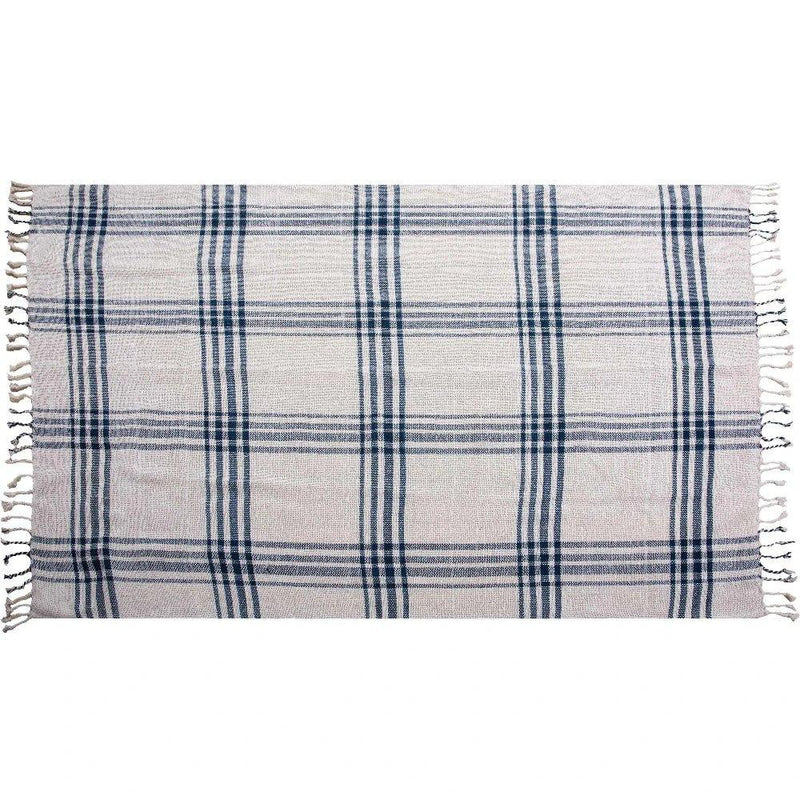 This yarn dyed handloomed throw is crafted of polyester PET. Hug the earth as you wrap yourself in the finest recycled product. Knock the chill or snuggle up for extra warmth under this abundantly proportioned throw. The warp ends of this throw are hand twisted and knotted to form a self fringe at both ends. This throw is medium weight and perfect for these changing seasons or for adding extra warmth to layers all ready. Wrap yourself in comfort with this Rizzy Home throw and infuse your living space with a warm invitation to get cozy. This 50" x 60" tasseled throw can be used in both indoor and outdoor living spaces--whether nestled into your favorite reading nook---or snuggled on the beach by a fire. Created from eco-friendly recycled fibers, this throw is not only beautiful, but also a sustainable addition to your home that you can feel good about. Expertly hand-loomed in an ultrasoft transitional plaid in a soft nature-inspired palette of coastal blue and sandy ivory, this throw will subtly harmonize with a variety of contemporary, transitional or coastal styles. The charm of this throw is elevated with the self-fringed ends, meticulously hand-twisted and knotted for added refinement.