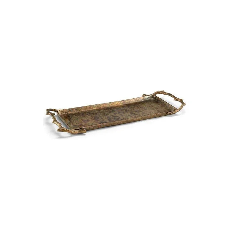 The Blue Ridge Tray brings a touch of elegance and nature-inspired design to any home. With its rich gold hue and flame finish, this tray is a striking piece that adds warmth to your decor. Crafted from high-quality aluminum, it promises durability while maintaining a lightweight feel. Its rectangular shape and earthy tones make it a versatile addition to various settings, whether you're hosting a gathering or simply decorating your living space. The textured surface not only enhances its visual appeal but also provides a practical surface for holding items securely. One of the standout features of the Blue Ridge Tray is its unique branch-like handles.