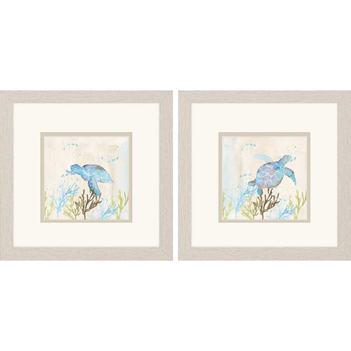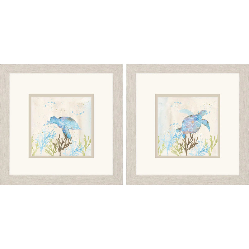 Bring the coastal charm right into your living space with this beautiful art set featuring vibrant blue sea turtles. Each piece is matted in white, creating a clean and crisp look that enhances the vivid colors of the turtles. The artwork is framed in a distressed whitewash finish moulding, adding a touch of rustic elegance. Perfect for those who appreciate marine life and wish to add a splash of color to their home decor, this set offers a delightful nod to oceanic themes. Its watercolor style, with hints of green and beige, brings a serene and calming effect to any room.