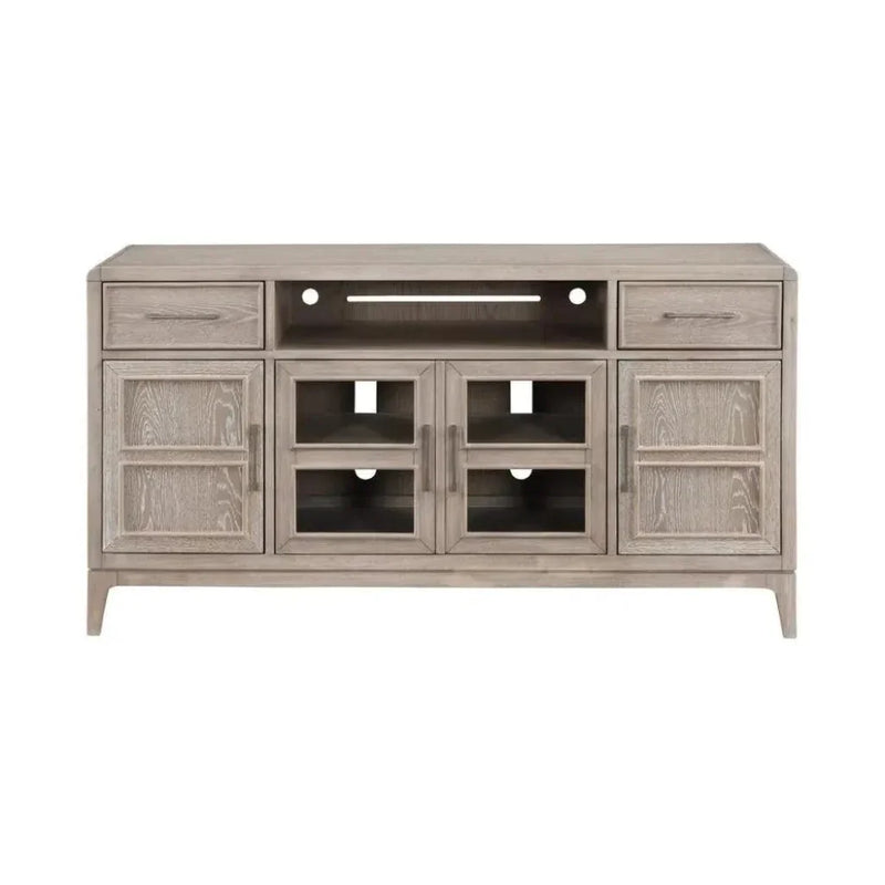 Two drawers for storage feature framed drawer fronts and brushed silver pulls. The center opening and center glass door cabinet is perfect for housing your media devices and offers openings in the back for wire management. The two side cabinets are perfect for storage and keeping your living room clutter free. Curved edges create a modern look that exudes sophistication and style.